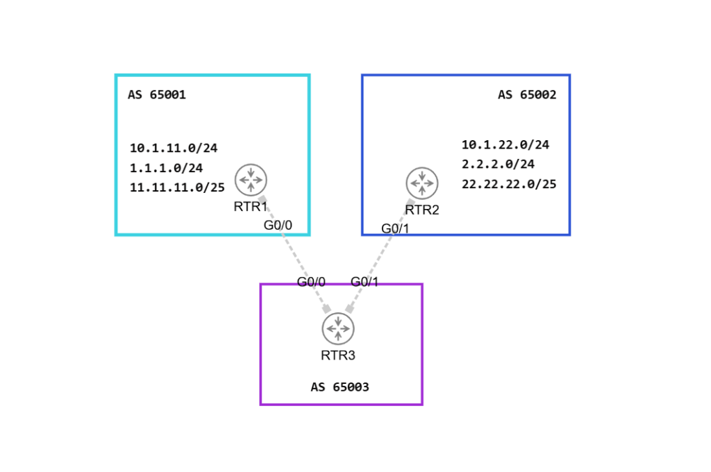 RTR3 has an eBGP session with RTR1 and RTR2. RTR1 should not receive the route for network 10.1.22.0/24. RTR2 should not receive the route for network 10.1.11.0/24. A route-map has been configured on RTR3 and applied to the neighbors, but RTR1 and RTR2 are receiving all the routes. Investigate and resolve the issue, if possible.