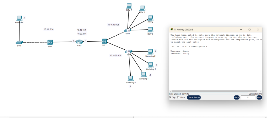 You have been asked to make sure the network diagram is up to date including IPs. The current diagram is missing IPs for the DEV devices.